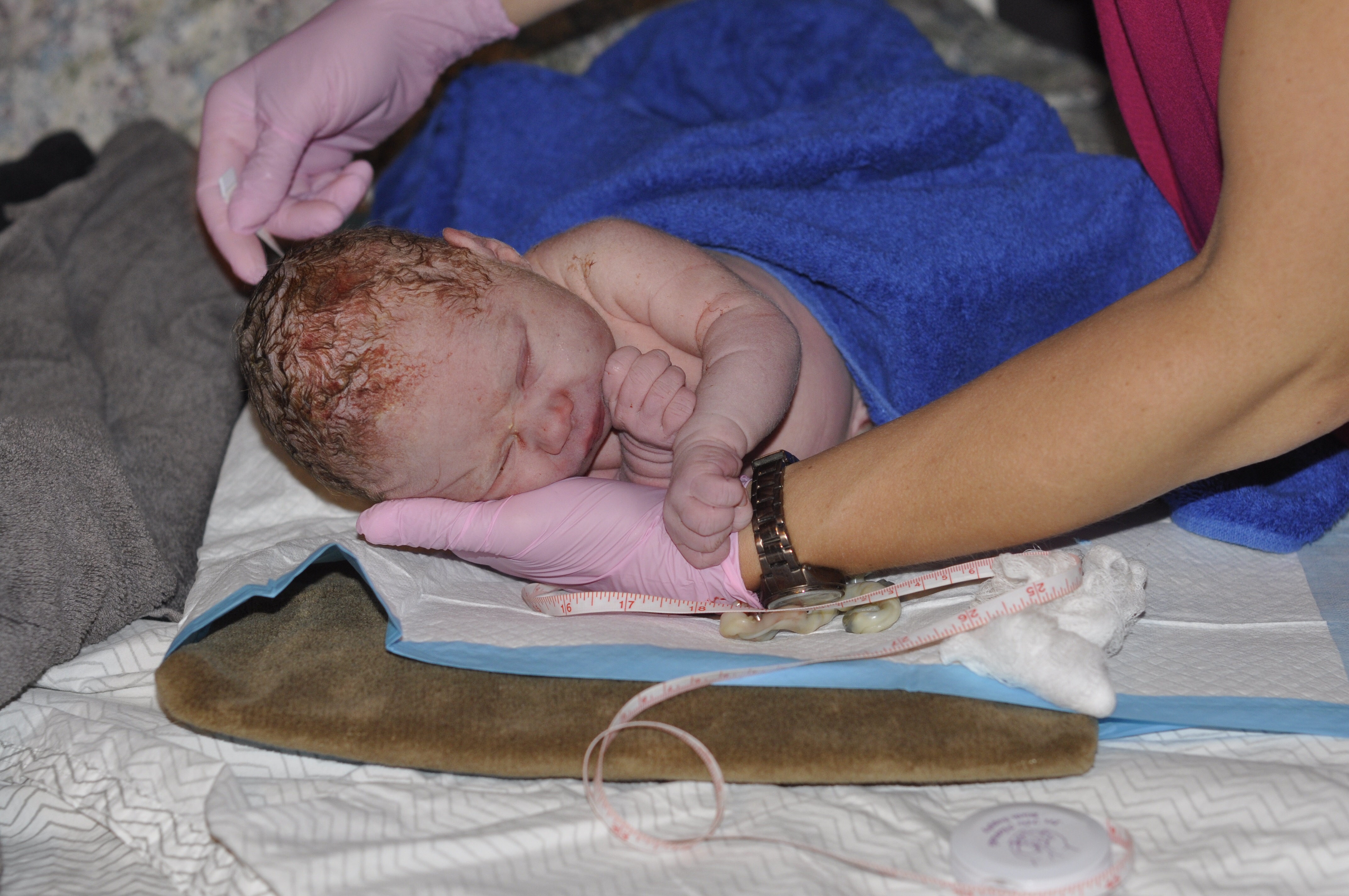 When we pulled up, Karen (midwife) came to meet us at the car. She told me to relax because we needed to go inside. When a contraction ended I got up and walked in the house, barefoot again, and told her the contractions were on top of each other and I needed to go to the bathroom. She said that might be a head. I said it was probably a few things.